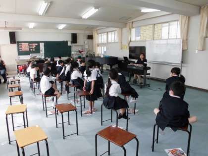1年生は音楽の授業中でした。初めての音楽室で初めての授業ということで、少し緊張していたみたいですが、しっかり校歌を歌えていたようで素晴らしいです(^^)