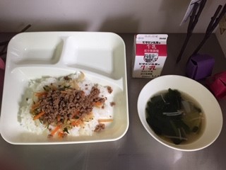 今日の給食は、ビビンバ、牛乳、トック、です。