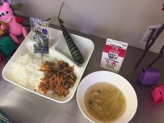 今日の給食は、きんぴらちらし、牛乳、すまし汁、ちまき、です。