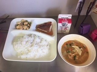 今日の給食は、ごはん、牛乳、あかうおのしょうゆだれかけ、みそ汁、えんどうの卵とじ、です。(「えんどうの卵とじ」は、「卵」の個別対応献立です。)