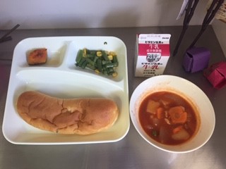 今日の給食は、おさつパン、牛乳、ケチャップ煮、さんどまめとコーンのソテー、焼きかぼちゃの甘みつかけ、です。