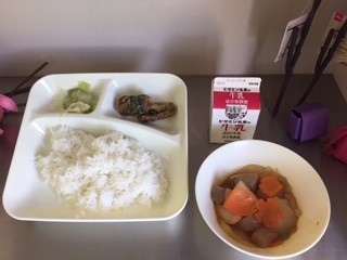 今日の給食は、ごはん、牛乳、ちくわのいそべあげ、あつあげとさといものみそ煮、あっさりキャベツ、です。