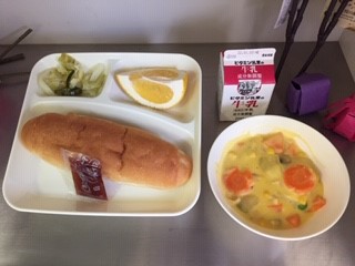 今日の給食は、コッペパン、いちごジャム、牛乳、コーンクリームシチュー、キャベツときゅうりのサラダ、かわちばんかん、です。