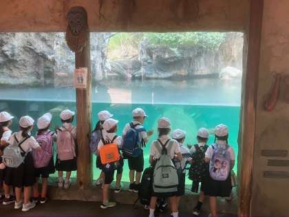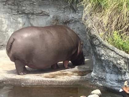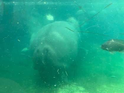 「大きい!」「泳げるんや!」大きなカバが泳ぐのを見て驚いています。