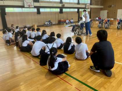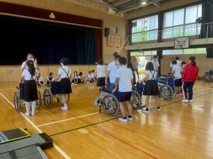 リハビリテーションセンターの紹介や、実際に車いすに触ったり乗ったり、押してみたりしました。子ども達は、「思っていたより操作が難しく、ちょっとの段差でも車いすにとっては越えるのが大変だなあ」といった感想を持っていました。