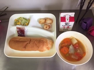 今日の給食は、コッペパン、いちごジャム、牛乳、いかてんぷら、フレッシュトマトのスープ煮、キャベツとコーンのソテー、です。