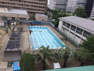 森之宮小学校では6月15日(木)にプール開きがあります。その日に向けて、今日は業者の方にプールの清掃をしてもらっています。昨日まで濁った水が入っていましたが、その水を抜いて、きれいにしていただいています。暑い夏がそこまできているようです。
