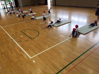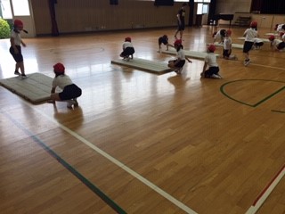1年生の体育の授業の様子です。マット運動を行っています。担任の先生から、「ねこになってみよう」「うまになってみよう」と指示があり、マットの上でそのポーズをしています。とても楽しそうに、そしてかわいい猫や犬、ワニもいました。