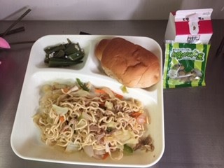 今日の給食は、黒糖パン、牛乳、和風焼きそば、オクラの甘酢あえ、まっ茶大豆、です。