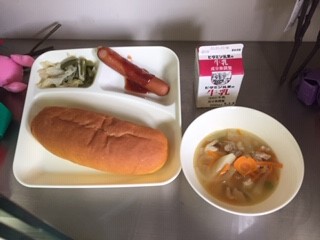 今日の給食は、パンプキンパン、牛乳、ウインナーのケチャップソース、スープ、キャベツとさんどまめのサラダ、です。