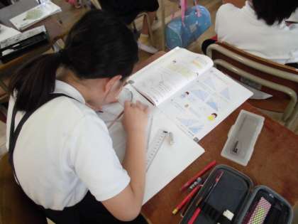 4年生は図形の学習に入っています。三角定規の角の大きさや、分度器を使っての角の計り方を学んでいます。初めて使う分度器にワクワクしながらも、計り方のポイントを押さえながら問題に挑戦していきました。