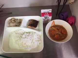 今日の給食は、ごはん、牛乳、さごしのつけ焼き、みそ汁、キャベツの赤じそあえ、です。