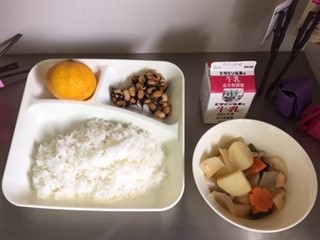 今日の給食は、ごはん、牛乳、鶏肉と野菜の煮もの、ひじき豆、みかん(冷凍)です。