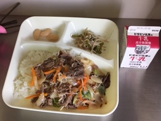 今日の給食は、牛丼、牛乳、もやしとピーマンのごまいため、大福豆の煮もの、です。