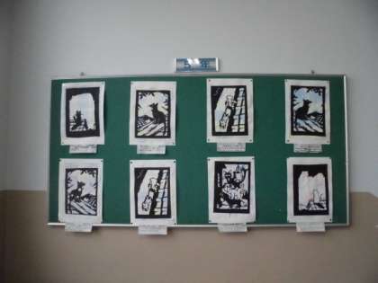 5年生は切り絵。ていねいにカッターを使って仕上げました。背景の白の中に何種類かの淡い色も混ぜているところがポイントです。