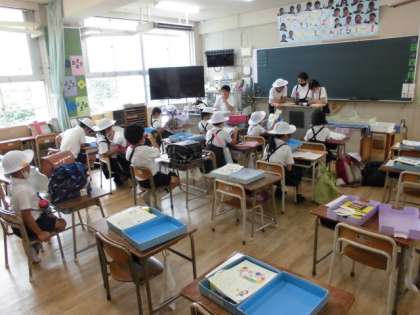 今日の5時間目は、登校班別に集まって夏休みの暮らしについて確認しました。危険な遊びや家出のルール、地域での過ごし方など、担当の先生と話をしていました。高学年が低学年の児童に優しく説明している姿が印象的でしたよ(^^)/