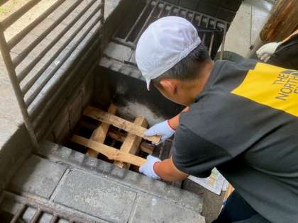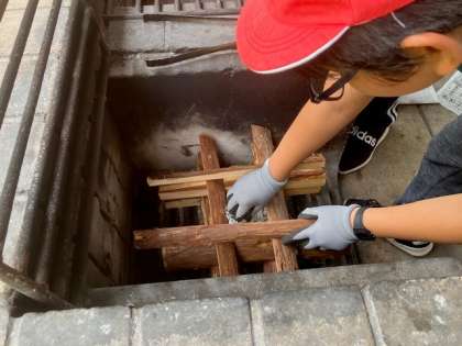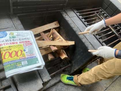 まずは薪をくべて、かまどを作ります。