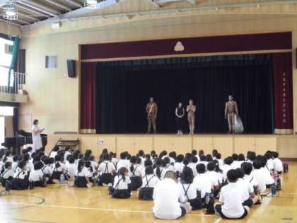 終業式の終わりに、本校の近くの森ノ宮ビックトップで行われているシルク・ドゥ・ソレイユ「アレグリアー新たなる光ー」に出演されているアーティストが本校を訪問され、パフォーマンスを見せてくださいました。関西テレビのアナウンサーから説明と紹介があって、登場したとき、子どもたちの期待も、この日の気温以上に高まりました。フラフープを使ったパフォーマンスを披露していただき、子どもたちの興奮も最高潮に。アーティストへの質問コーナーもあり、子どもたちにとってはとても夢のある時間になりました。