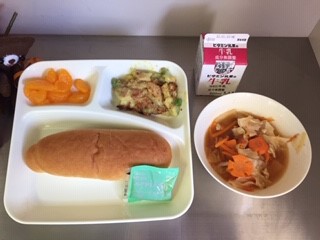 今日の給食は、コッペパン、りんごジャム、牛乳、豆乳マカロニグラタン【米粉】、トマトスープ、みかん(缶)です。