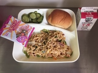 今日の給食は、黒糖パン(1/2)、牛乳、焼きそば、きゅうりのしょうがづけ、いもけんぴフィッシュ、です。
