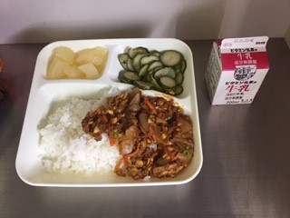 今日の給食は、大豆入りキーマカレーライス(米粉)、牛乳、きゅうりのサラダ、洋なし(カット缶)です。