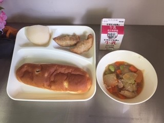 今日の給食は、おさつパン、牛乳、あげぎょうざ、鶏肉ととうがんの中華煮、なし(二十世紀)です。