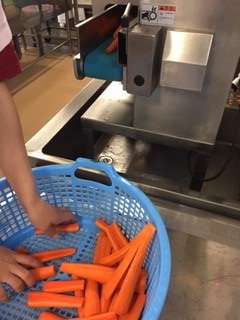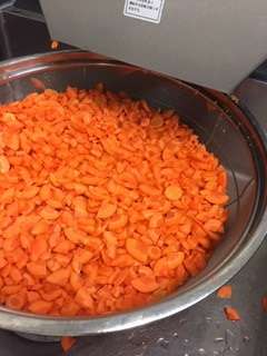 給食調理室の中でいつも気になるフードスライサー。今日は人参です。一瞬で細切れになってます。