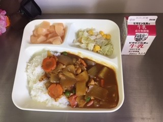 今日の給食は、チキンカレーライス(米粉)、牛乳、キャベツとコーンのサラダ、白桃(カット缶)です。