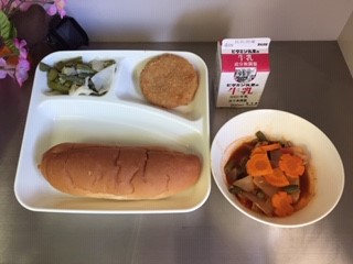今日の給食は、黒糖パン、牛乳、チキンレバーカツ、ケチャップ煮、グリーンアスパラガスとキャベツのサラダ、です。