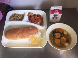 今日の給食は、コッペパン、マーマレード、牛乳、ヤンニョムチキン、とうふのスープ、切干しだいこんのナムル、です。