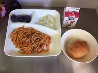 今日の給食は、黒糖パン(1/2)、牛乳、イタリアンスパゲッティ、キャベツのバジル風味サラダ、ぶどう(巨峰)、です。