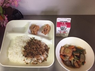 今日の給食は、ごはん、牛乳、鶏肉のたつたあげ、あつあげと野菜の煮もの、おかかなっ葉、です。