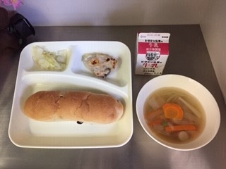 今日の給食は、レーズンパン、かつおのガーリックマリネ焼き【ノンエッグドレッシング】、ウインナーとじゃがいものスープ、キャベツのサラダ、です。