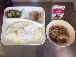 今日の給食は、ごはん、牛乳、豚肉のねぎじょうゆ焼き、ふきよせ煮、きゅうりの甘酢づけ、です。