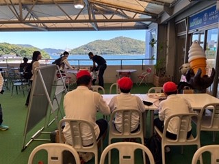 混雑する前に、海を眺めながら昼食をとっています。足りないそうです。