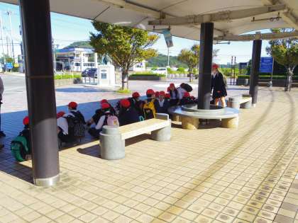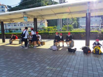 電車を待つ間も、友達との大切な時間です。たくさんしゃべりましょう。あれ?その人もおともだち?