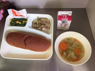 今日の給食は、黒糖パン、牛乳、豚肉のカレー風味焼き、鶏肉と野菜のスープ、さんどまめとコーンのサラダ[ノンエッグドレッシング]です。