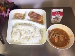 今日の給食は、ごはん、牛乳、あかうおのしょうゆだれかけ、豚汁、もやしのゆずの香あえ、です。