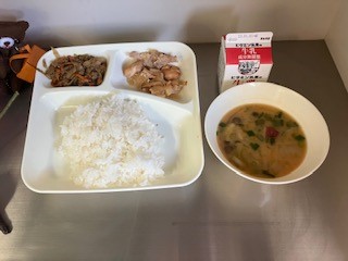 こんな時間ですが、今日の給食は、ごはん、牛乳、体ポカポカ鶏肉のしょうが焼き、ほくほくさつまいもみそ汁、ピリッとひき肉きんぴらごぼう、です。