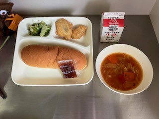 今日の給食は、コッペパン、いちごジャム、牛乳、白身魚フリッター、ミネストローネ、ブロッコリーのサラダ、です。