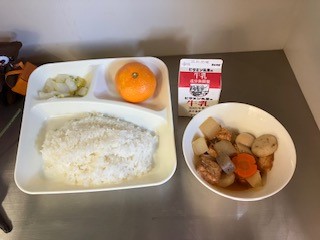 今日の給食は、ごはん、牛乳、関東煮、はくさいの甘酢あえ、みかん、です。
