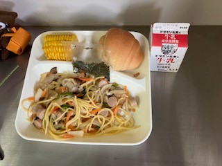今日の給食は、黒糖パン(1/2)、牛乳、ウインナーときのこの和風スパゲッティ、焼きとうもろこし、固形チーズ、です。