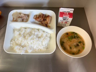 今日の給食は、ごはん、牛乳、鶏肉の甘辛焼き、みそ汁、だいこんの煮もの、です。