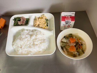 今日の給食は、ごはん、牛乳、具だくさん卵の千種焼き、五目汁、豚肉とさんどまめのいためもの、です。