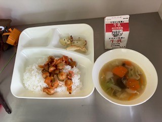 今日の給食では、ケチャップライス、が登場しています。炒めたベーコン、ウインナー、たまねぎ、ピーマン、にケチャップやウスターソースと調味料を加え煮込みます。この具をごはんにかけて混ぜ合わせて食べます。ケチャップの甘さがごはんと合う一品です。