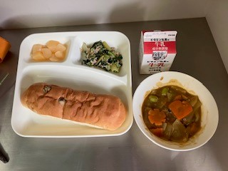 今日の給食は、レーズンパン、牛乳、ミートボールと野菜のカレー煮、ツナとこまつなのソテー、白桃(カット缶)です。