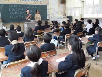 2年生に在籍児童の保護者の方2名をお呼びして、外国の文化について触れる時間を設けました。お二方はロシア・タジキスタンのご出身で、今回はロシア語(文字)について教えていただきました(^^)