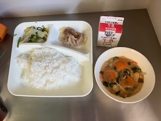 今日の給食は、ごはん、牛乳、豚肉のごまだれ焼き、みそ汁、きくなとはくさいのおひたし、です。