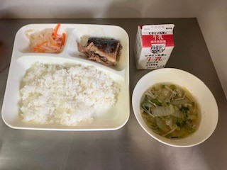 今日の給食は、ごはん、牛乳、さばのみそ煮、すまし汁、紅白なます、です。
