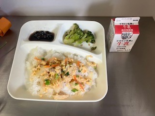 今日の給食は、親子丼、牛乳、ブロッコリーのごまあえ、黒豆の煮もの、です。